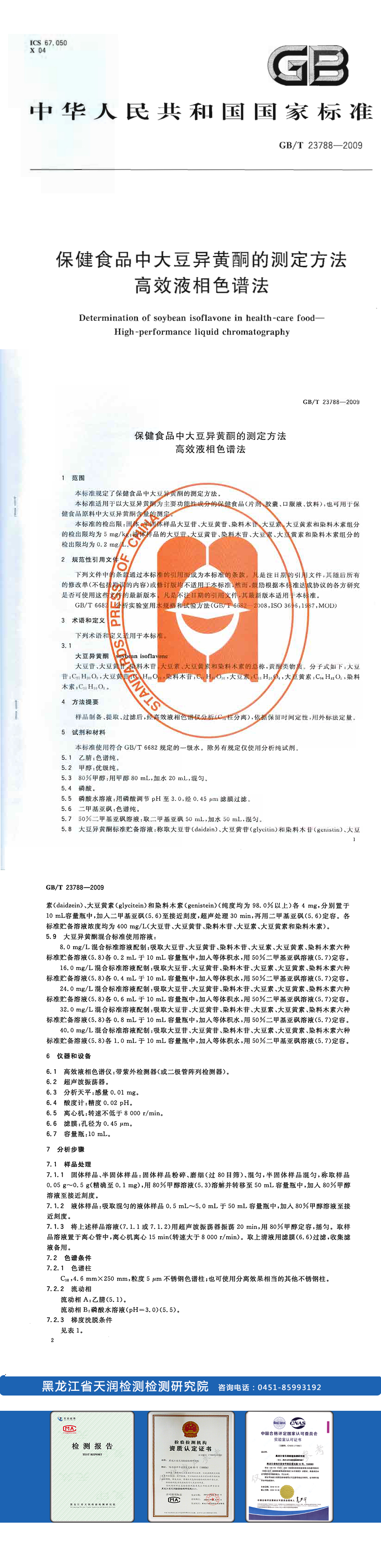 本標準規定了保健食品中大豆異黃酮的測定方法。本標準適用于以大豆異黃酮為主要功能性成分的保健食品(片劑、膠囊、口服液、飲料),也可用于保健食品原料中大豆異黃酮含量的測定。